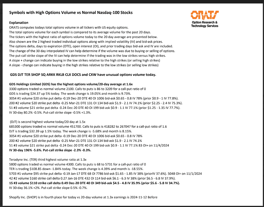 GDS, DJT, TER, SHOP, SQ, ARKK, RKLB, CLX, DOCS, and CXW have unusual options volume today.