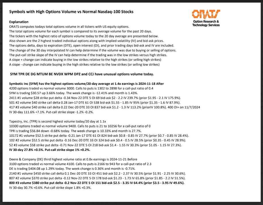 SYM, TPR, DE, DG, MTUM, BE, NVDX, WPM, DPZ, and CCJ have unusual options volume today.