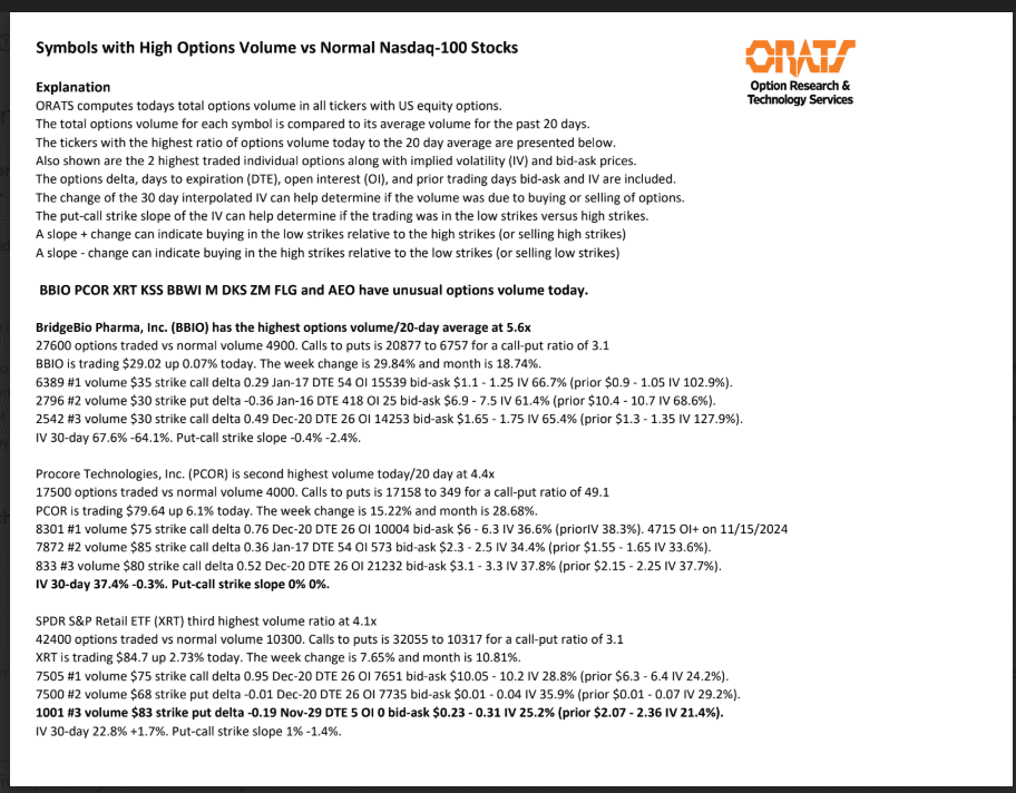 BBIO, PCOR, XRT, KSS, BBWI, M, DKS, ZM, FLG, and AEO have unusual options volume today.