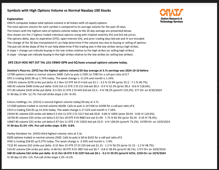 DPZ, CELH, HOG, NET, DJT, TAL, LEU, CRWD, GPN, and SQ have unusual options volume today.