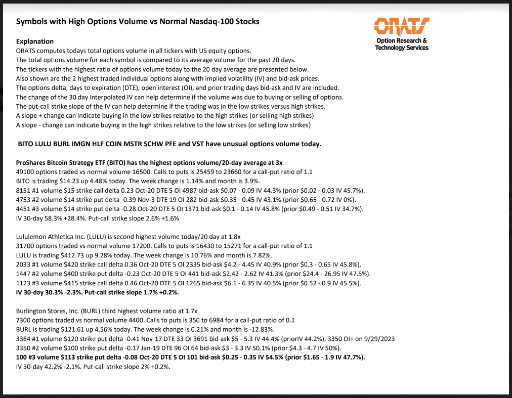 BITO, LULU, BURL, IMGN, HLF, COIN, MSTR, SCHW, PFE, and VST have unusual options volume today.