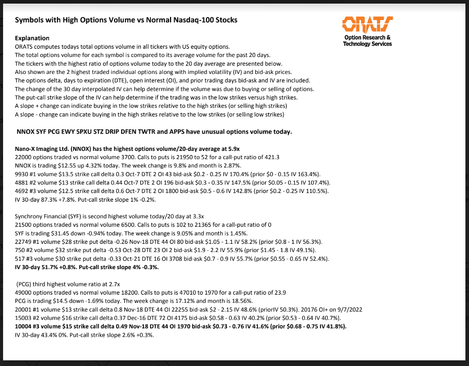NNOX, SYF, PCG, EWY, SPXU, STZ, DRIP, DFEN, TWTR, and APPS have unusual options volume today.