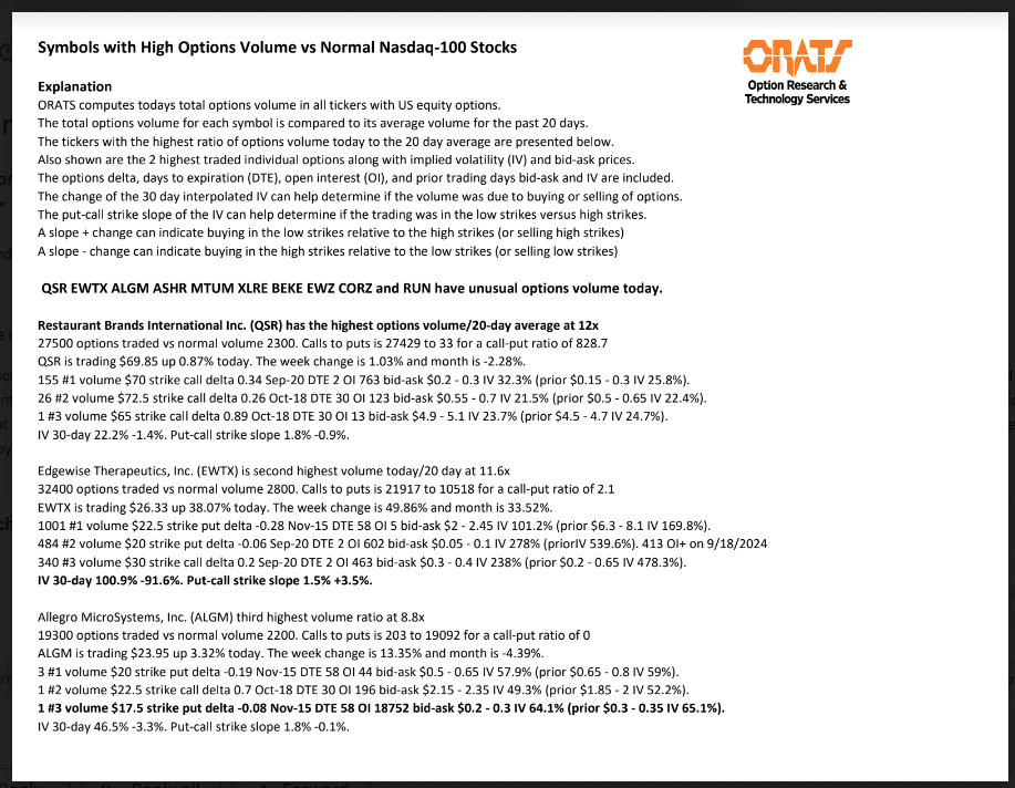 QSR, EWTX, ALGM, ASHR, MTUM, XLRE, BEKE, EWZ, CORZ, and RUN have unusual options volume today.