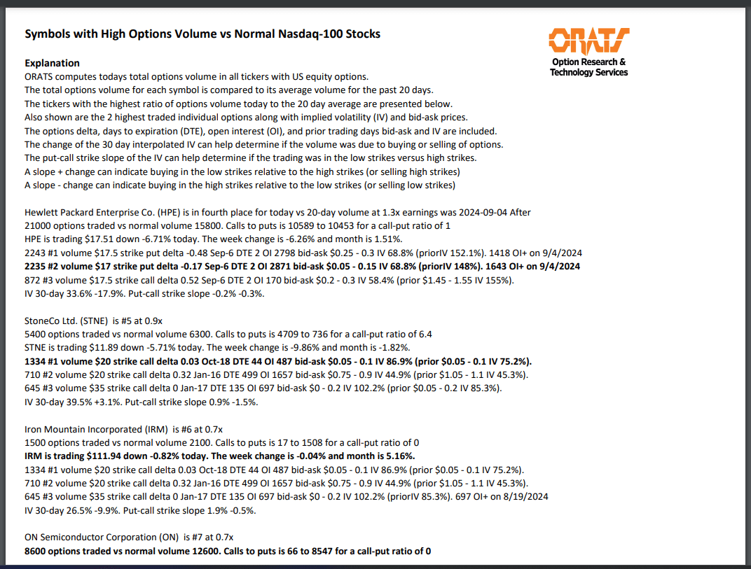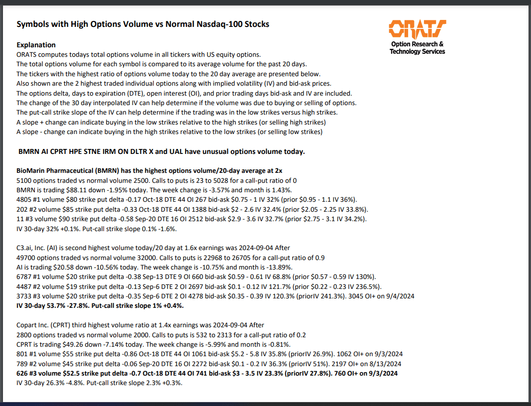 BMRN, AI, CPRT, HPE, STNE, IRM, ON, DLTR, X, and UAL have unusual options volume today. For more information please see: https://orats.com/earnings