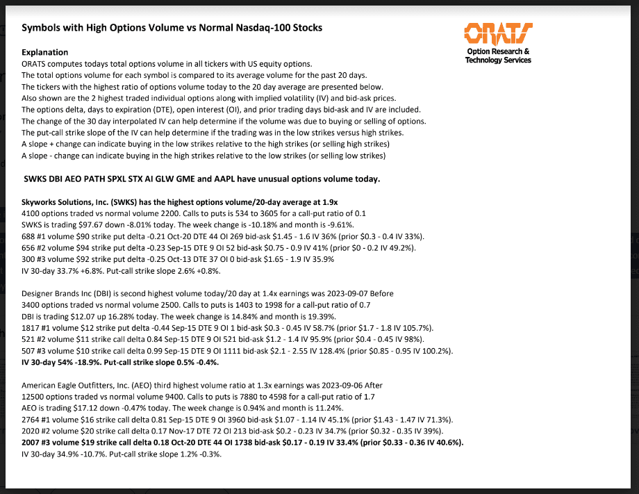 SWKS, DBI, AEO, PATH, SPXL, STX, AI, GLW, GME and AAPL have unusual options volume today.