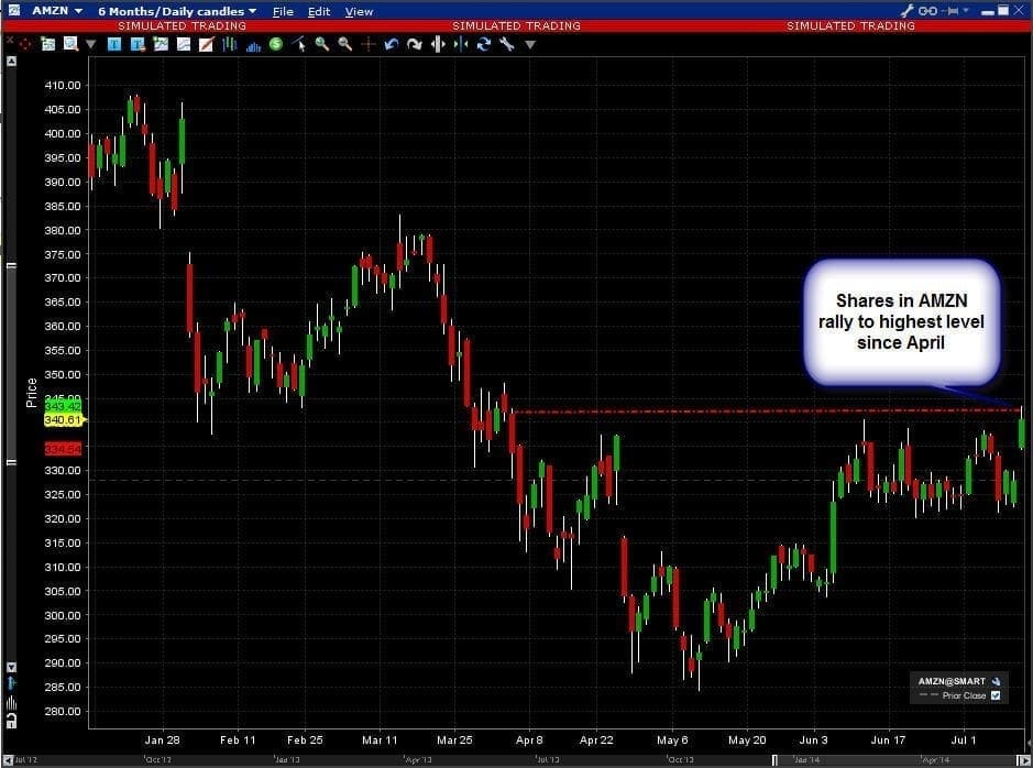 Options on Amazon.com, Inc. (Ticker: AMZN) are seeing heavy volume on the final trading session of the week amid strong gains in the price of the stock, which is currently up more than 4.0% on the day at $342.09 and the highest level since April. At last check, more than 127,000 options contracts have changed hands on Amazon or twice the stock?s average daily options volume of around 63,100 contracts. Call options are more active than puts as of the time of this writing, with the call/put ratio hovering near 1.33 just before midday in New York. The bulk of the volume is in the 11Jul?14 weekly options currently in their final day of trading prior to expiration, and in the 18Jul?14 expiry calls and puts. Amazon.com reports second-quarter earnings after the close of trading on July 24th.