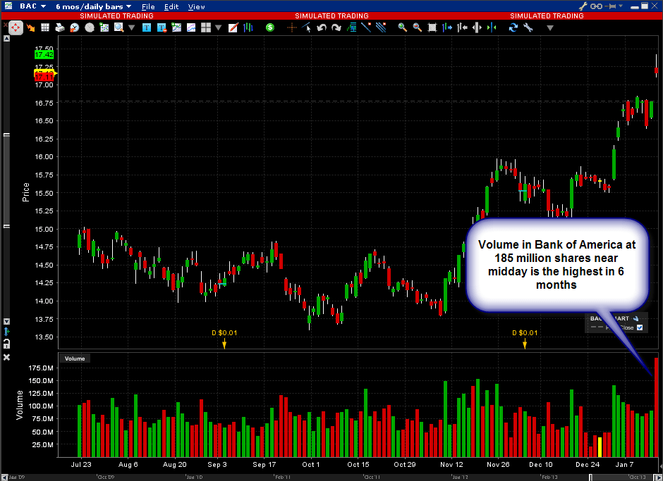 Options traders are favoring BAC calls over puts, with the call/put ratio hovering near 2.6 as of the time of this writing. The most traded contracts on Bank of America during the first half of the trading session were the 17 Jan ?14 calls. Earnings reports from some of the big banks this week and strong retail sales data released on Tuesday helped the S&P 500 Index climb to a fresh record on an intraday basis, with the Index touching 1850.77 earlier in the session. Shares in JPMorgan (Ticker: JPM) continue to march higher today, adding to gains on the back of its fourth-quarter earnings release on Tuesday, while Wells Fargo (Ticker: WFC), which saw its shares in negative territory following Q4 earnings, rebounded sharply today to reach a new 52-week high.