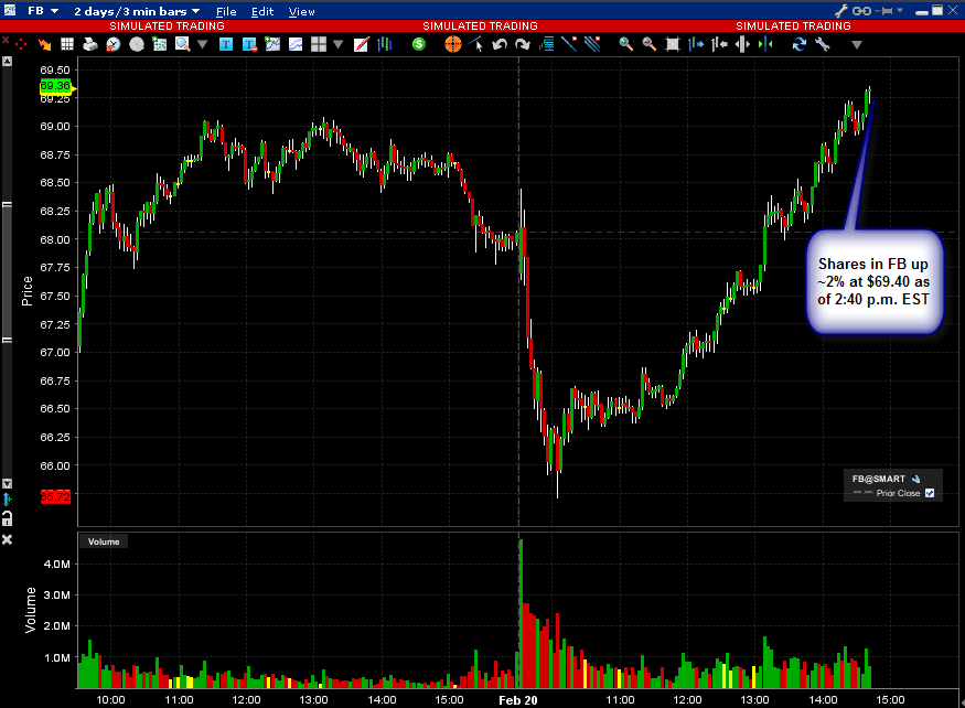 Shares in Facebook Inc. (Ticker: FB), which fell during aftermarket trading on Wednesday following an announcement by the company that it has agreed to buy mobile-messaging startup WhatsApp Inc. for $4 billion in cash, $12 billion in stock and $3 billion in restricted shares, staged a midday comeback on Thursday. The turn around in the price of the underlying appears to have sent options traders scrambling and volume in FB options to roughly 200% of the stock?s average daily reading before 3:00 p.m. EST. Shares in Facebook declined as much as 3.4% during morning trading to touch down at an intraday low of $65.72 just after 10:00 a.m. EST, bounced off that level and haven?t looked back. The shares are up nearly 2.0% at $69.40 as of the time of this writing. Based upon the turnaround in the price of the underlying, one might expect less volatility to accompany the relief rally in Facebook?s shares, but the opposite appears to be happening. The closing reading of options implied volatility midweek of 34.8% has jumped to 38.3% today (+10%) despite the near 2% gain for the stock.
