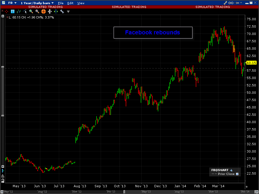 Call options expiring in May were the most active trades in social media giant Facebook (Ticker: FB) as it rebounded by 3.11% to $60.00 midweek. At the start of the week the shares touched a near three-month low at $55.44 having shed 23.5% since reaching a post-IPO high of $72.59 in March. The 16May?14 60.0 strike call option traded at a premium of $4.35 almost 25,000 times this morning and nearly equal to the established volume of open interest. The calls were likely purchased judging by the sale of 33,725 of the May 65.0 strike call options where open interest stands at 63,200 contracts. The higher strike call options traded at a premium of $2.29 which imply a lower net cost of effectively getting long of the stock. Total options volume on Facebook of 143,000 contracts by 10:40am ET maintains its buoyant bias. Total daily options volume on the stock has exceeded 200,000 contracts each trading session since February 10th.