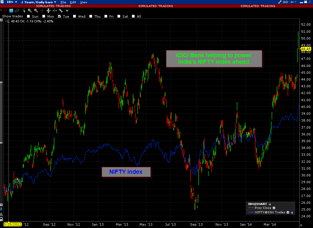 Shares in ICICI Bank Ltd. (Ticker: IBN) rallied nearly 20% in the first two weeks of May to touch $50.97 on Monday, the highest level since April of 2011. IBN is moving higher amid strong performance in Indian equities spurred by recent elections in the country. The chart below shows periods of relative outperformance in ICICI Bank?s shares versus the broader NIFTY Index, including recent outperformance of the shares.