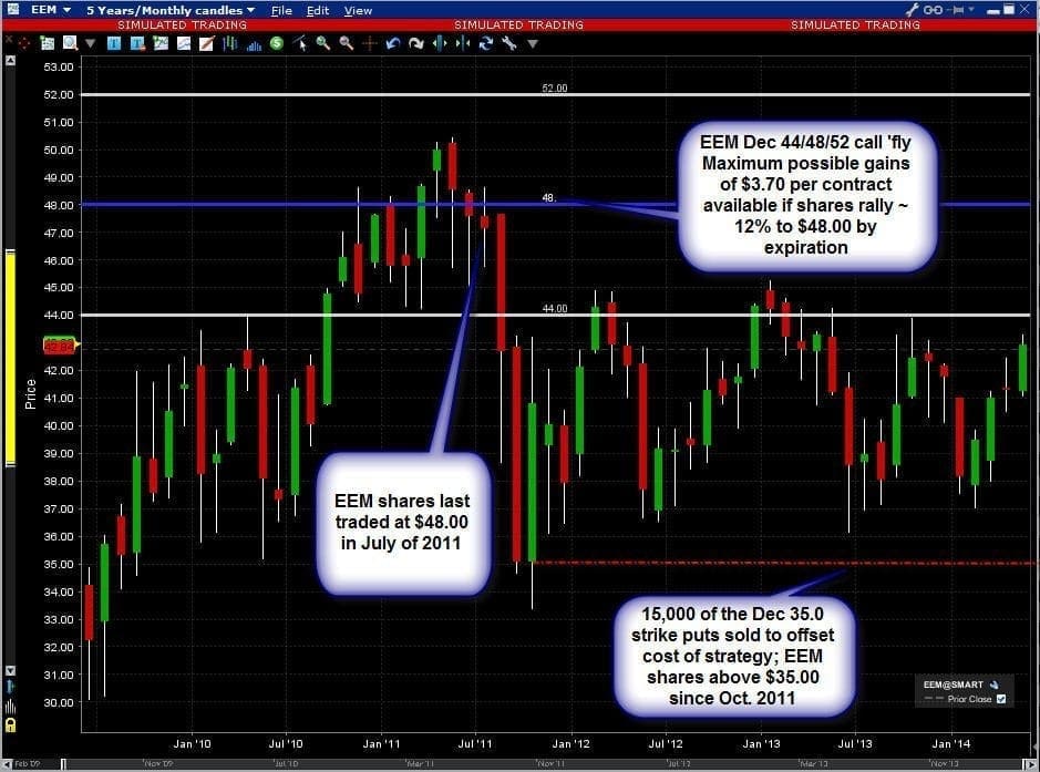Chart ? EEM shares up in 2014, Dec 44/48/52 call ?fly eyes further upside