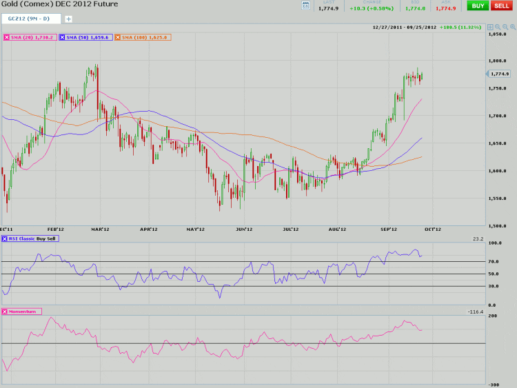 Turning to the chart, we see the December Gold contract consolidating just above the 1750 level. The preceding move higher suggests that prices may have a slight upward bias. The next upside barrier may be found at the 1800 level. The RSI remains overbought, suggesting the market may continue to consolidate or, possibly, pull back.