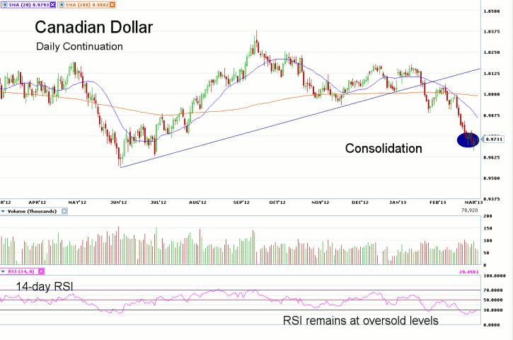 The 14-day RSI continues to linger at oversold levels, with a current reading of 28.21. The most recent downward price movement seems to have found some support below 0.9700, as many weak longs appear to have exited their positions ahead of the BOC interest rate announcement. Support is seen at the March 1st low of 0.9665, with resistance seen at the 20-day MA currently near the 1.0042 price level.