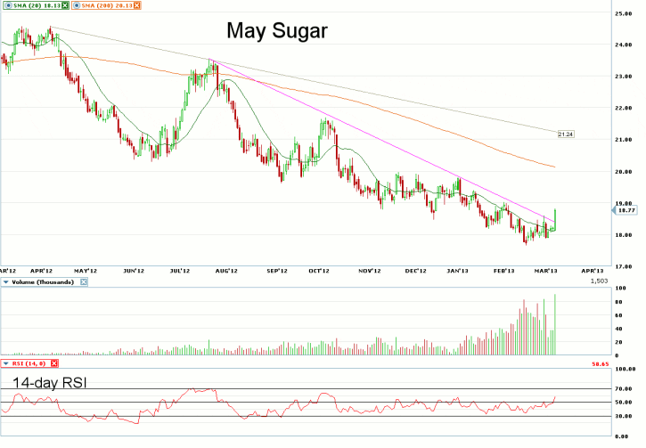 Looking at the daily chart for May sugar, we notice the downtrend line drawn from the July 20th high was taken out during Thursday’s sharp price rally. The 14-day RSI has turned positive, with a current reading of 56.86. Looking at the price movement of the May/July spread, we note that since the middle of January, the May contract has rallied 0.50 points vs. July and may have signaled that the bear run is nearing an end.