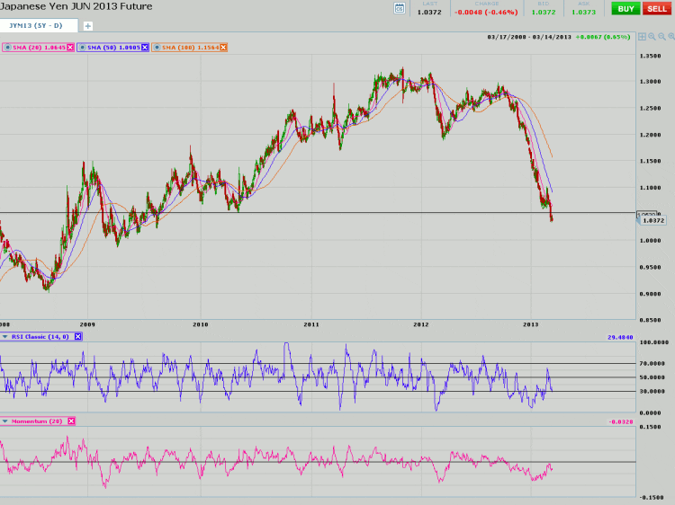 Turning to the chart, we see the June Japanese Yen contract falling to its lowest level since June 25, 2009.