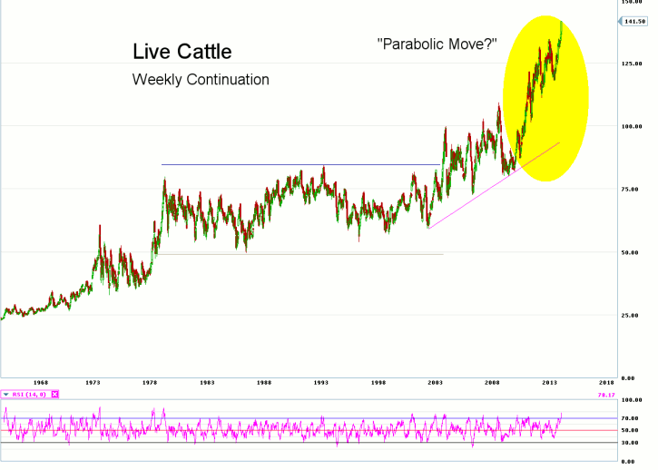 Looking at the weekly continuation chart for Live Cattle futures (symbols LC), we notice that after spending nearly 24 years trading in a relatively narrow 35-cent per pound price range (approximately 50 cents to 85 cents per pound from 1978 to 2002), Live Cattle prices have been in a gradual uptrend since 2002, with prices now more than doubling in the past 12 years. The up-move in prices is becoming ?parabolic? if we measure starting at the most recent low back in June of 2013.