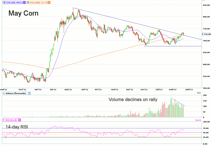 Prices are holding right at the 200-day moving average and are currently just above the 20-day MA. We note that trading volume was declining on the recent rally attempt, which may indicate a lack of aggressive new buying on the recent up-move. Near-term resistance for May Corn is seen at the recent high of 734.50, with longer-term resistance seen at 750.00. Support is found at the 20-day moving average, currently near the 709.50 price area.