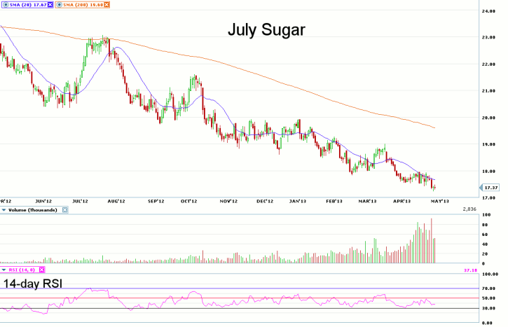 Looking at the daily chart for July Sugar, we notice prices falling below the recent 17.50 to 18.00 trading range prices have been in for most of April. However a failure to come close to testing the 17.00 price level triggered a bout of short-covering buying which has moved prices back towards the low end of the recent price range. Volume in the July futures has increased lately, but this is mainly due to the rolling of positions from the May contract ahead of the last trading day on April 30th.