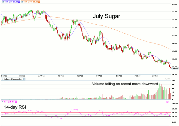 Traders looking for a bottom in price will note that trading volume has fallen the past 10 days or so while prices were making new lows. This could be a sign that new bears are not entering the market at current price levels, and a short-covering rally may not be out of the question in the coming sessions. 16.00 is seen as the next chart support level for July Sugar, with resistance found at the 20-day moving average, currently near the 17.45 price area.