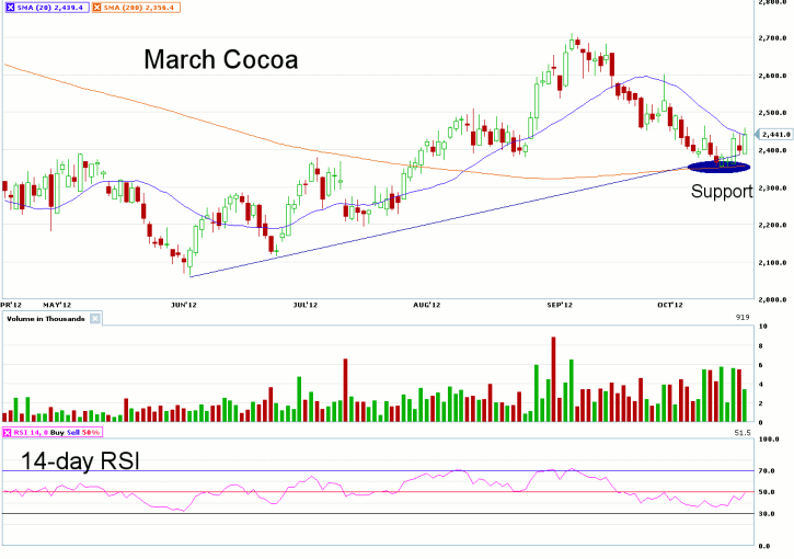 Longer-term, it is expected that Cocoa production may fall short of demand in the 2012-13 season, with estimates from the International Cocoa Organization calling for a 100,000 metric ton deficit. If true, we may see a longer-term bottom forming in prices, especially if production problems emerge due to weather or political events in the West African growing regions.
