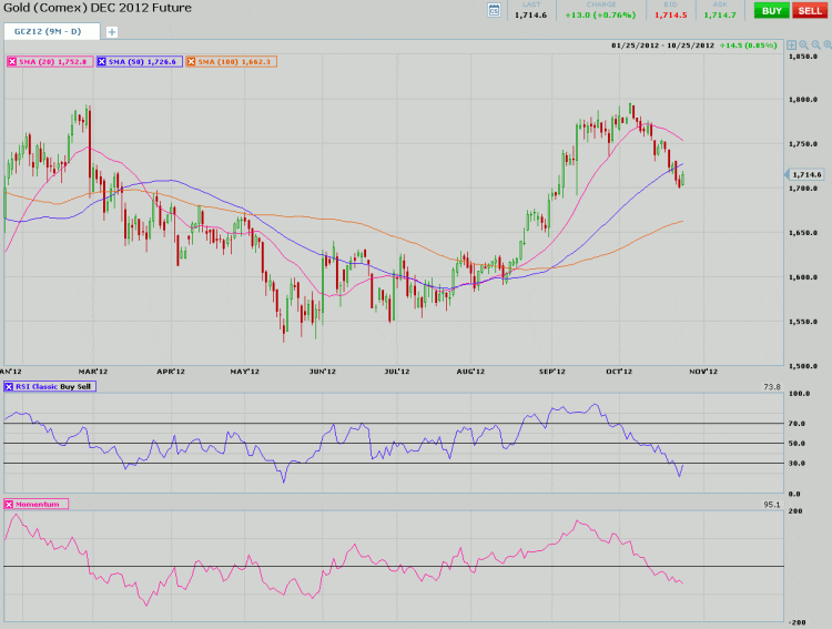 Turning to the chart, we see the December Gold chart trading near support at the 1700 mark. The recent sell-off began after the third failed attempt to break through the 1800 level, over the past year. Prices are now below the 50-day moving average, which can be seen as bearish. The recent selling has resulted in the RSI indicator being in oversold territory, which could trigger some short covering and value buying.