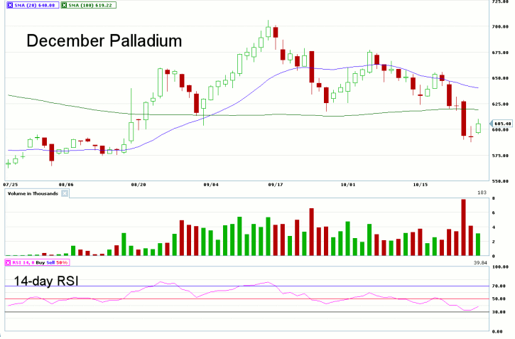 The 14-day RSI is weak but not yet in oversold territory with a current reading of 38.54. 558.75 is seen as the next support level for December Palladium, with resistance found at the 100-day moving average, currently near 619.20.