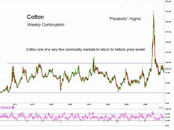 After an historic price spike during the 2010-11 season, Cotton prices have returned to their historic price range of the past 40 or so years despite large purchases by China the past year. China appears to be taking advantage of sharply lower Cotton prices this past year to replenish state-owned reserves, which were depleted during the 2010-11 bull market when Cotton prices traded over the $2 per pound price level.