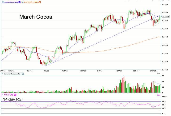 Just as grain traders eagerly await the latest USDA crop reports, Cocoa traders are keenly interested in the Cocoa grinding report that is released quarterly. These reports, which measure the amounts of Cocoa processed in the U.S., Europe and Asia, help to measure the global demand for Chocolate and other Cocoa products. Estimates for the 4th quarter European Cocoa ?grind? are for an increase of just over 4%, which follows increases of 4.7% and 6 % respectively in the 2nd and 3rd quarters of 2013. North American Cocoa grindings are expected to have increased by 4.1% in the 4th quarter on increased demand for Chocolate for the holiday season. The National Confectioner?s Association will release the data at 4 pm ET on January 16th.?? ?