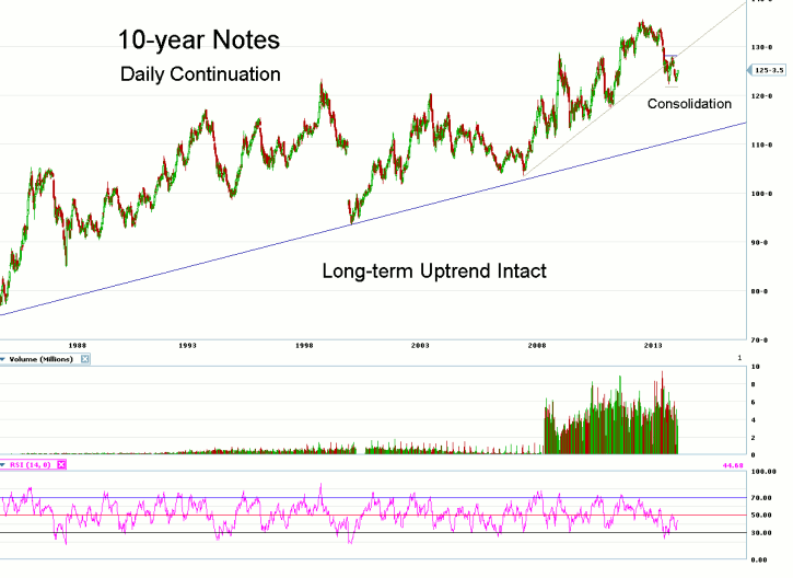 Looking at the weekly continuation chart for 10-year Note futures (symbol TY), we notice that the uptrend drawn from the major 2007 lows have been breached and the market has begun a consolidation phase between 122-00 and 128-00 for the past 6 months. For long-term traders, the bull market is still in force and would take a weekly close below the 110-00 price level to stop the bull in its tracks. Support for the front month March contract is seen at 122-03.5 with resistance found at 126-25.