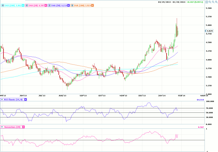 Turning to the chart, we see that the March Natural Gas (NGH14) contract blasted through resistance at the 4.50 level with ease.? However, yesterday?s price action formed what could potentially be seen as a reversal day. The body of yesterday?s candlestick is inside the prior day?s range, somewhat diluting the reversal indicator.? If prices are able to hold the 4.50 level, prices may continue higher.? The next resistance area may be found at 5.400.
