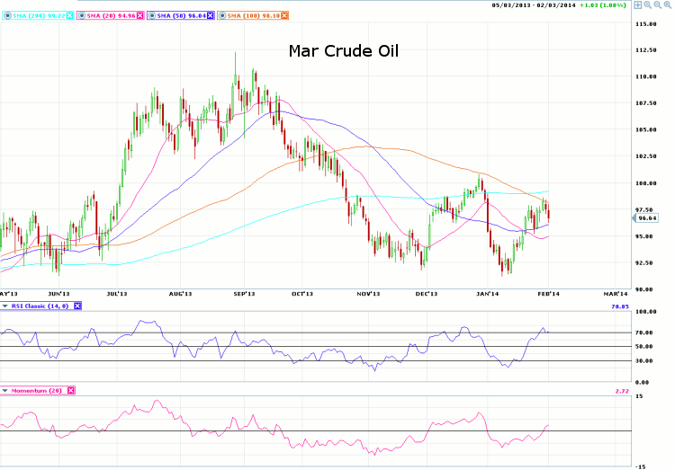 Turning to the chart, we see the March Crude Oil contract unable to mount a successful attempt to break through minor resistance near the 98.80 level.? The Crude Oil market is currently technically overbought, which may have contributed to the selling pressure.? Prices also failed to break through the 100-day moving average.