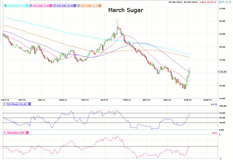 Turning to the chart, we see the March Sugar contract forming a sharp reversal after spending a few days teetering near the 15.00 mark.? Yesterday?s price action suggests the reversal may be short lived, as the March contract formed a spinning top on the daily chart.? The market settled just above the 50-day moving average and could build momentum if prices manage to stay above the average.