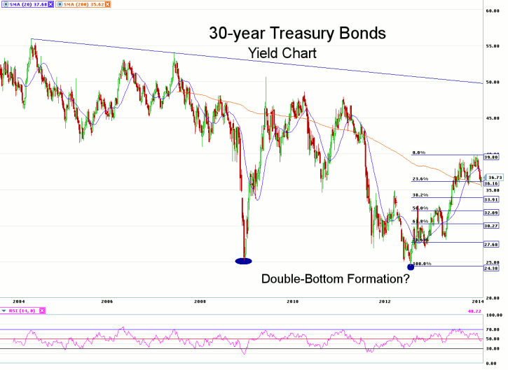 Looking at a weekly yield chart for the 30-year Treasury Bond for the past 10 years, we notice what appears to be a double-bottom formation as yields approached 2.5% back in late 2008, as well as again in the summer of 2012. Since the July 2012 lows, yields have rallied nearly 1.5%, but still remain well below the average highs of the past 10 years.?