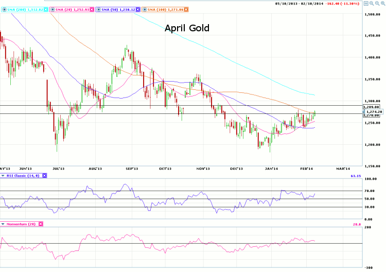 Turning to chart, we see the April Gold contract continue to grind higher since making a relative low in late December.? Prices are now entering a band of resistance between 1270 and 1289, which will be a test for the market in the near-term.? Prices closed above the 100-day moving average yesterday; however, the April Gold contract hardly did so in convincing fashion.? Several solid closes above the 100-day moving average may be viewed a bullish over the intermediate term for Gold.