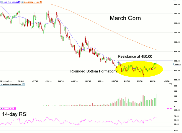 Looking at the daily chart for March Corn, we note what may be shaping-up as a ?rounded bottom? formation cumulating in the downward price spike and subsequent upside reversal made back on January 10th. Prices appear to be running into some chart resistance near the 450.00 level, which is a price level not seen in the March futures since late November.
