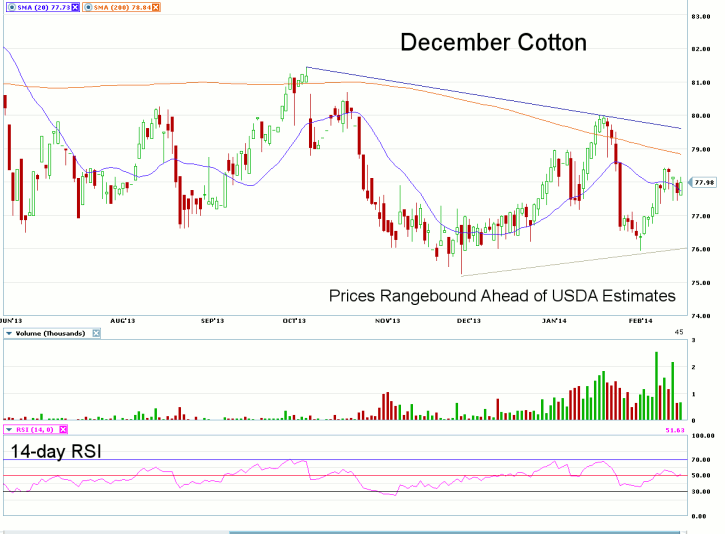 Looking at the daily chart for new-crop December Cotton, we notice prices becoming rangebound, with a price boundary between 75 and 80 cents per pound. Trading has been slow in the new-crop months so far this year, however trader interest may likely increase as we move closer to the USDA prospective plantings report due out at the end of March.? Prices are currently hovering near the 20-day moving average (MA), but remain slightly below the 200-day MA currently near the 78.85 price level. Near-term support is seen at the February 3rd low of 75.96, with near-term resistance seen at 80.00.