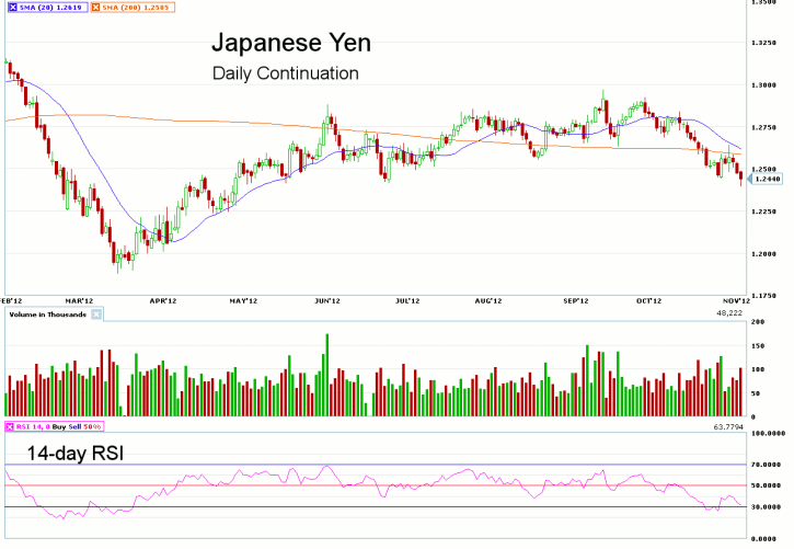 The 14-day RSI is weak, with a current reading of 31.08. The April 20th lows of 1.2233 look to be the next support level for the December futures with resistance found at the October 30th highs of 1.2640.