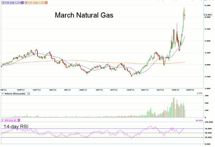 Looking at the daily chart for March Natural Gas, we notice prices went parabolic last week, moving nearly $1 in just three trading sessions. Prices seem to have found some resistance at 6.400, as some good selling has emerged near this price level. Option traders have been aggressive in the out-of-the-money March calls, as a spike in implied volatility triggered short-covering buying in strikes ranging from $7 to $10 last week, despite these options having less than a week left before expiration, with the futures trading near $6. ?Rich? premiums for these options have lured some premium sellers into the Natural Gas options market that would not normally have an interest in this product. This should make for interesting options expiration on Tuesday, as market participants position themselves for a potentially ?interesting? trading session on Wednesday when the March futures go off the board.? The 6.400 price level remains as resistance for the March futures, with support found near 5.500.???