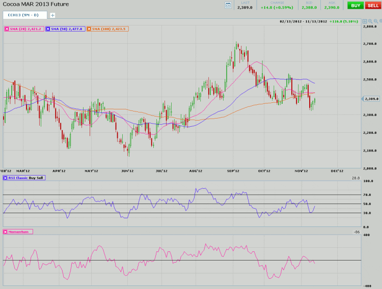 Turning to the chart, we see the March Cocoa contract steadily sliding since early September. Prices are now below the 20, 50 and 100-day moving averages, which can be seen as negative. The next significant area of support comes in near the 2300 level. In order to gain some traction, prices may need to cross back above the 2500 level.