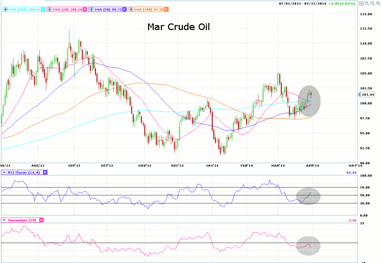 Turning to the chart, we see the May Crude Oil contract grinding higher over the past few weeks.? Prices did jump a bit after crossing the 100 level, indicating some shorts may have been squeezed out of the market.? Friday and yesterday?s close both hinted at a possible near-term reversal. It is interesting to note that the 20-day momentum is negatively diverging from the RSI indicator and price.? This suggests the market may be set to reverse.