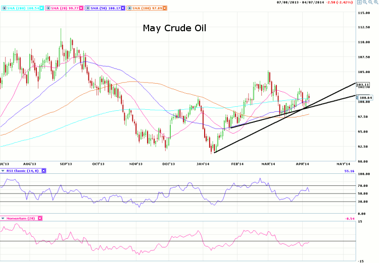 Turning to the chart, we see the May Crude Oil contract failing to test the March 28 relative high before falling back yesterday.? Thus far, Oil prices have held above the uptrend lines.? Failure to hold these trendlines may result in heavier near-term selling pressure.? Momentum remains below the zero line and is flatter than both prices and the RSI indicator, hinting as possible near-term weakness.? Prices have not been able to post more than two consecutive closes above the 100- day moving average.