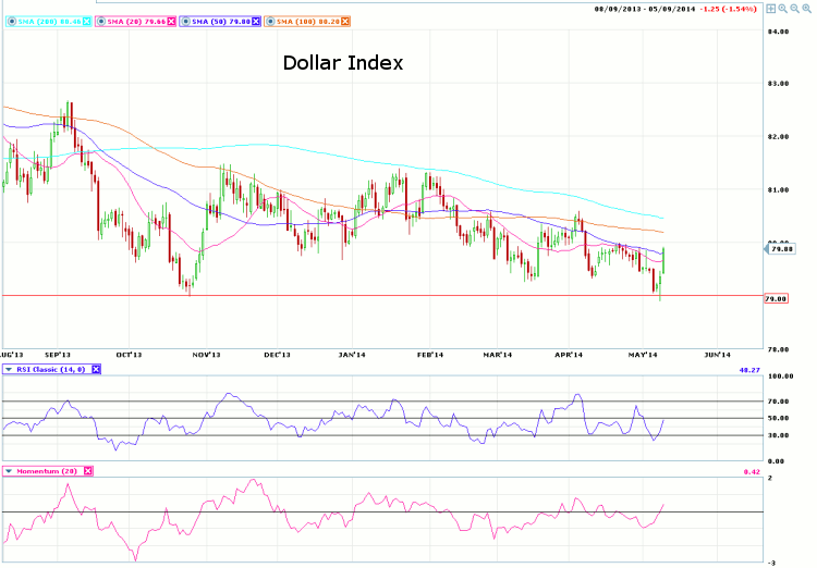 The US Dollar got a bit of a boost from softer March German manufacturing data, which showed regression.? New orders fell 2.8% in adjusted terms versus forecasts of a 0.2% increase in orders.? The ECB held interest rates steady at 0.25%.? There is some speculation that the ECB may go in the opposite direction of the Federal Reserve and begin asset purchases to weaken the currency.? The Fed continues to be an enigma, not committing to an interest rate timetable.? It is widely believed that the Fed will completely eliminate asset purchases by the end of the year, which will remove some money supply.