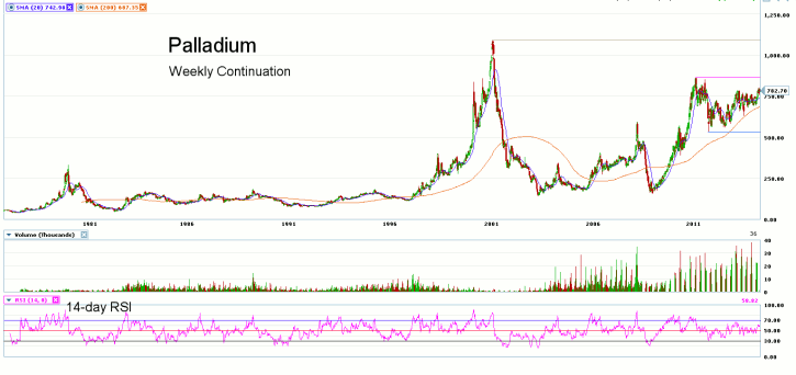 Looking at the weekly continuation chart for Palladium futures, we notice what was once a rather quiet market suddenly became alive back in 1998, which ushered in a rather volatile trading pattern for the past 16 years. The run-up to the peak in prices back in 2001 did not last long, as the market quickly retreated back to ?historic? price levels in about 2 year?s time. Prices appear poised to break out from the recent consolidation phase, although there is still some upside resistance at the 2011 highs.? Near-term resistance is seen at the recent high of 802.45, with support found at the March 20th ?spike? low of 746.30.