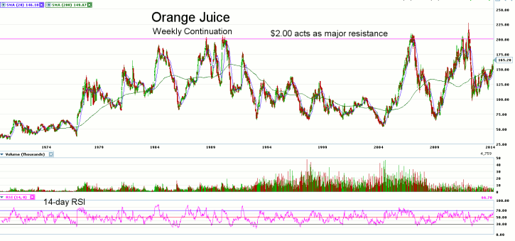 Looking at the weekly continuation chart for O.J. futures, we note that historically, O.J. prices have been unable to sustain price rallies above the $2 per pound price level, a feat that has only occurred 5-times in the past 40 year. Although the current bull market is still well shy of historic price levels, we should note a rather strong price base has formed from which prices have broken out to the upside. Trading volume has waned starting in 2008 due mainly to a lack of large speculative interest. Near-term resistance for the front-month May contract is seen at 170.00, with support found near the 135.00 price level.??