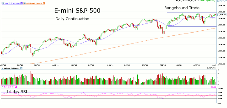 Looking at the daily continuation chart for the E-mini S&P 500 futures, we notice the market treading water since mid-February as the market has been confined within a 100 point range. Prices are currently above the 20-day moving average and momentum as measured by the 14-day RSI is neutral to strong with a current reading of 57.39. 1786.25 looks to be near-term support for the lead-month June futures, with resistance found at the contract high of 1892.50.