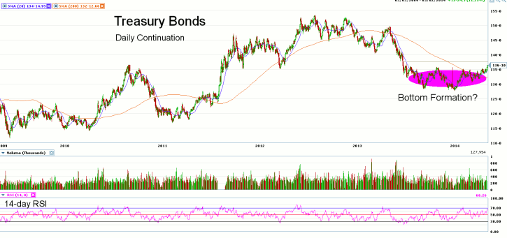 Looking at the daily continuation chart for Treasury Bond futures, we note that prices appear to be trying to form a fairly significant bottom should we see a weekly close above long term resistance at 137-23. Prices are starting to trend above the 20-day moving average and momentum as measured by the 14-day RSI is strong with a current reading of 67.59. The next support level is seen at the April 4th lows of 131-21.??