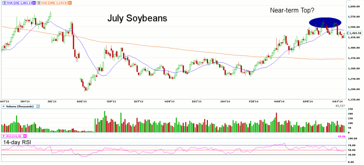 Looking at the daily chart for July Soybeans, we notice what appears to be a rounded top formation on the daily chart. Prices have retreated nearly? 90-cents since recent high were made, but a bout of short-covering buying, as well as better than expected old-crop exports last week have put an end to the recent price sell-off at least for now. Trading volume has been light the past several weeks, despite a move towards multi-month highs. 1365.50 is seen a strong support for July Soybeans, with resistance found at the recent highs of 1531.75.?