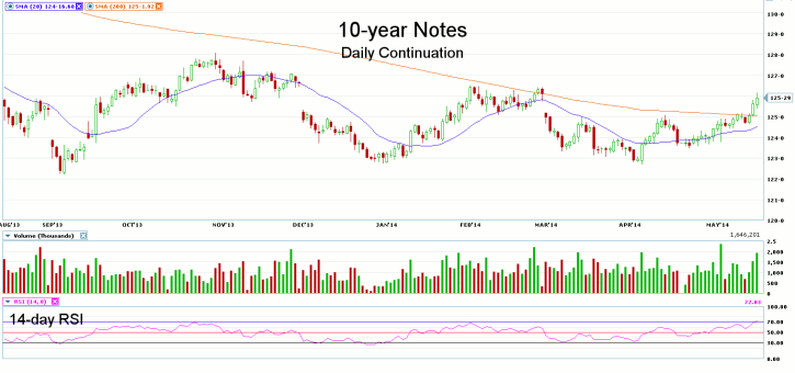 Looking at the daily chart for June 10-year Note futures, we notice what may be an upside breakout from the two month long consolidation pattern where prices were holding within a 2-point range. The recent price rally is adding confirmation to the rounded-bottom formation that appears on the daily chart. Prices are above both the 20 and 200-day moving averages and the 14-day RSI is strong, having just nudged above 70 with a current reading of 72.03. 126-16.0 is seen as the next resistance level for the front month 10-year Note futures, with support found at 123-16.0.