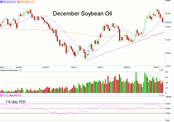 Looking at the daily chart for December Soybean Oil, we notice what appears to be a double-top formation, with the September 4th highs taking out the previous highs made back in April, but the market failed to hold at these lofty price levels. Prices are attempting to hold above the 20-day moving average, and this indicator looks to be acting as a support point for the December futures. The 14-day RSI has bumped-up against the 70 level, but has now turned lower and is currently reading a more neutral 52.68. Support is seen at the August 29th low of 55.67, with resistance found at the recent high of 58.60.