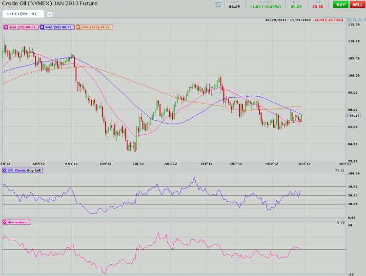 Turning to the chart, the January Crude Oil contract has been mired in range bound trading between 85.00 and 90.00 over the past month and a half. A convincing breakout out of either end of this range will likely determine the intermediate direction of the market. The oscillators are giving neutral readings, which gives some traders little to work with.
